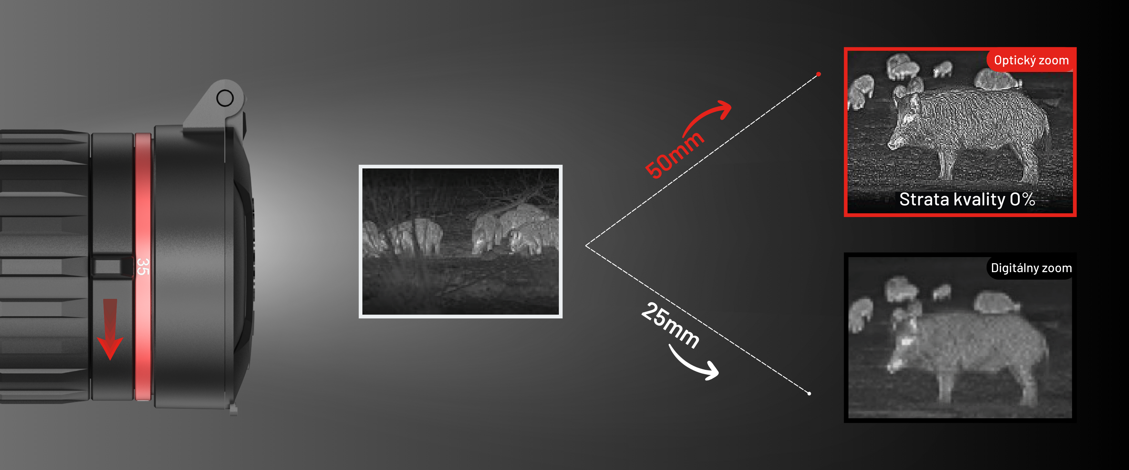 Funkcia dvojnásobného optického zoomu spočíva v dvoch šošovkách v jednom prístroji, vďaka ktorým si môžete meniť šírku zorného poľa podľa Vašej potreby. Šošovka s ohniskovou vzdialenosťou 25 mm s pevným optickým zväčšením 2,2x dáva zameriavaču možnosť detekcie na 1200 metrov a šošovka s ohniskovou vzdialenosťou 50 mm so zväčšením 4,3x až na 2600 metrov.